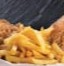 arroz, papas fritas, fideos y una presa de pollo, todo en una sola bandeja. una porcion perfecta para una persona con buen apetito
